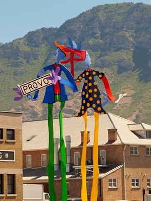 How to get there: When you’re finished at the Covey Center, head east on Center Street. This time, you’ll be walking along the south side, past more great restaurants and unique local businesses. At about 250 West, just past Taylor Maid beauty and theatrical supply store, you’ll see a small sculpture nestled within a hedge.